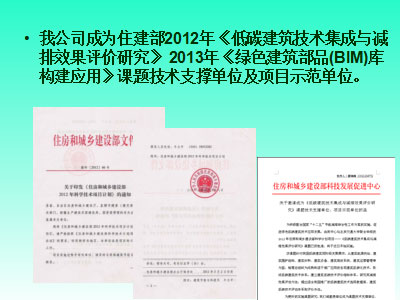 我公司成為住建部2012年《低碳建筑技術(shù)集成與減排效果評價研究》 2013年《綠色建筑部品(BIM)庫構(gòu)建應(yīng)用》課題技術(shù)支撐單位及項目示范單位。